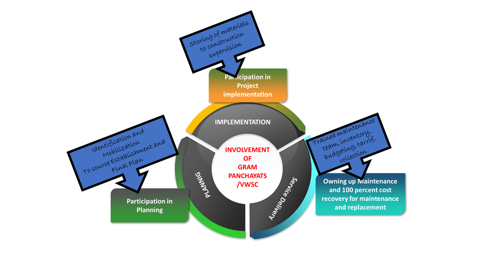 Essential features of demand driven and participatory approach include Participatory Planning, Capital Cost contribution, Capacity Building, Participatory Implementation, Participatory Water Quality Management, Participatory Sanitation and Water Conservation, Development of Local Work force followed by Budgeting, Accounting and Billing for Cost recovery. These are briefly explained below: