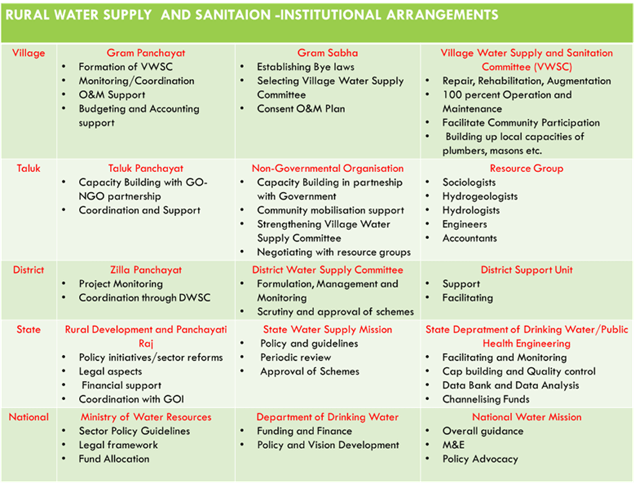 Table 1 below outlines the suggested roles at the National, State, District, Taluk, and Village Levels, with the Panchayati Raj Department assuming a pivotal role in ensuring assured, sustained, and safe water supply to the village community. The department engages in a credible Government-NGO partnership at the Taluk and Gram Panchayat Levels, playing a crucial role in developing local resources for the operation, maintenance, and cost recovery of constructed water supply schemes.
