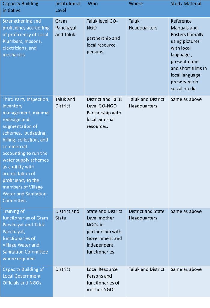Table 2 below outlines a comprehensive Capacity Building Action Plan, acknowledging the potential time lag in initiating the initiative. Despite this delay, it is anticipated that enthusiastic and motivated local NGO officials will play a crucial role in encouraging community ownership and the effective operation of water supply schemes.